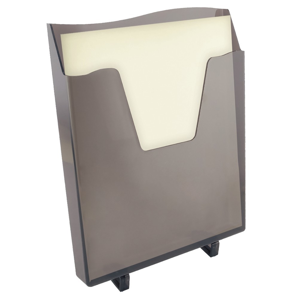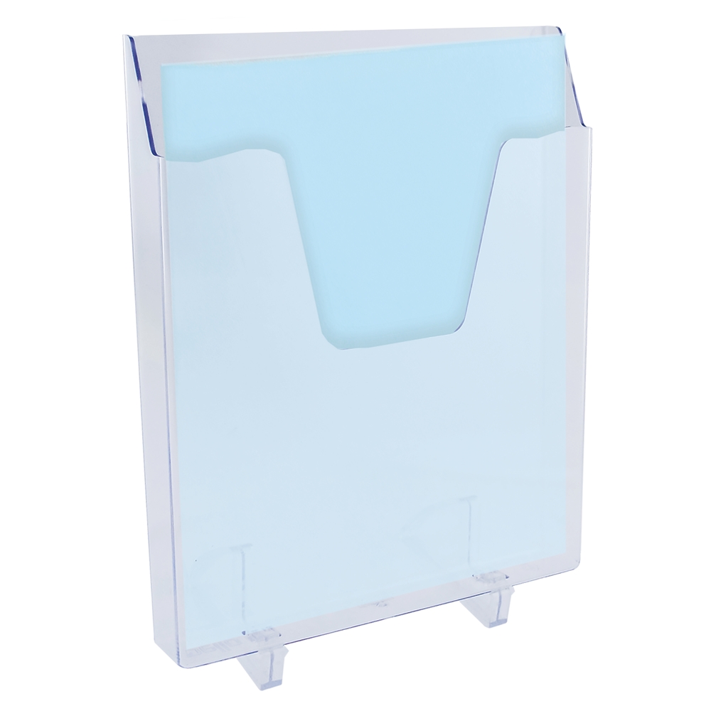 Expositor em poliestireno. Pode ser utilizado em cima da mesa (pés removíveis) ou fixado na parede.