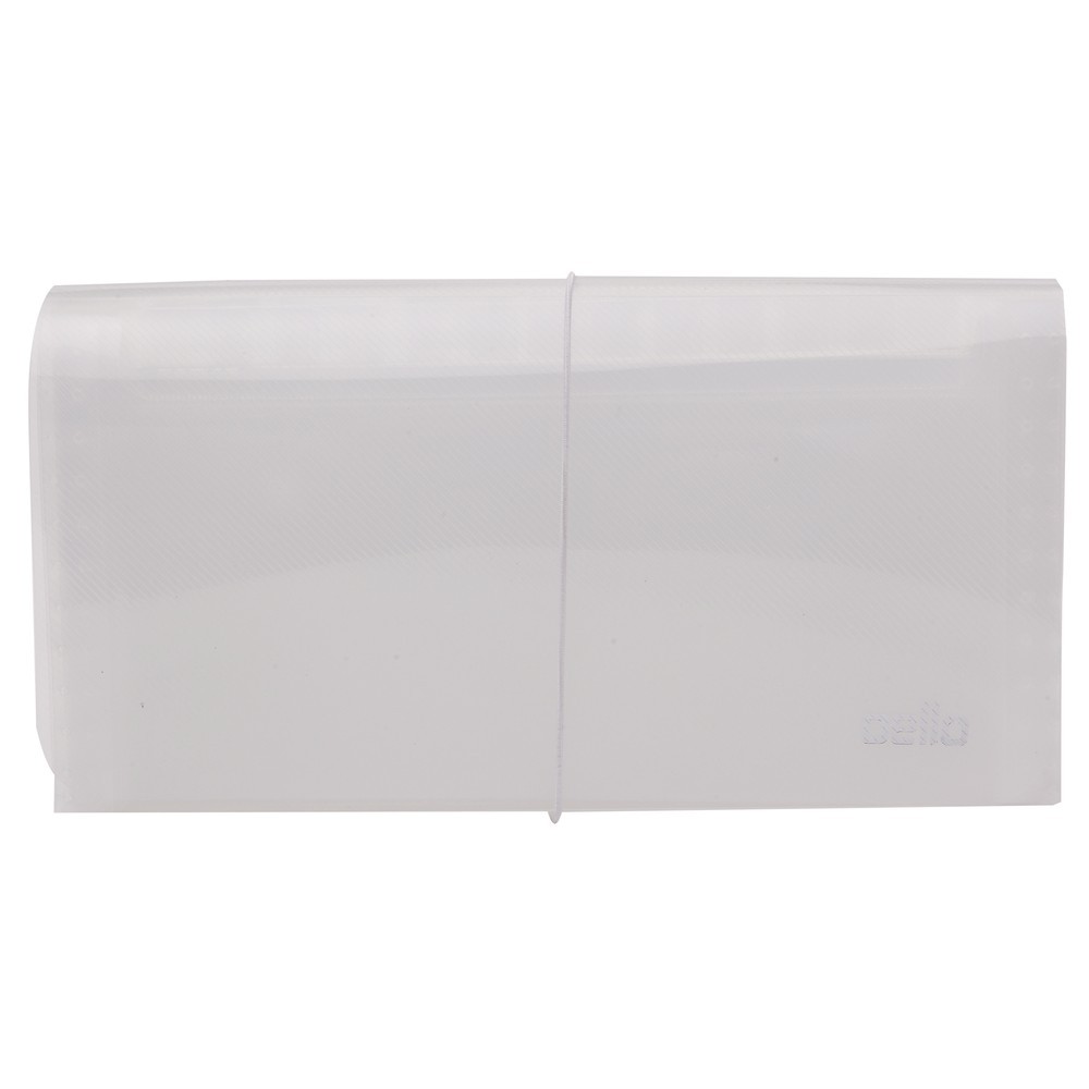 Pasta sanfonada laminada em polipropileno. Acompanha visores e etiquetas para identificação das divisórias. Fechamento com elástico.